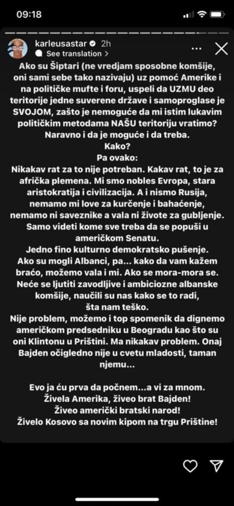 – Pa ovako: Nikakav rat za to nije potreban. kakav rat, to je za afrička plemena. mi smo nobles Evropa, stara aristokratija i civilizacija. A i nismo Rusija, nemamo mi love za k**čenje i bahaćenje, nemamo ni saveznike, a vala ni života za gubljenje. Samo videti kome sve treba da se p**uši u američkom Senatu. Jedno fino, kulturno, demokratsko p**enje. Ako su mogli Albanci, pa… kako da vam kažem braćo, možemo vala i mi. Ako se mora- mora se. Neće se ljutiti zavodljive i ambiciozne albanske komšije, naučili su nas kako se to radi, šta nam teško– napisala je Karleuša i dodala: