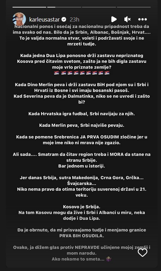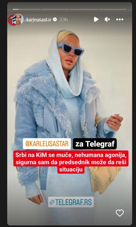 Karleuša je na svom Instagram storiju objavila čitav pamflet poruka, danima unazad, o Kosovu i Metohiji.