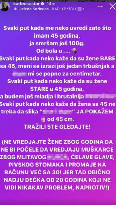 – Svaki put kada me neko uvredi zato što imam 45 godina, ja smršam još 100 grama. Od bola u… Svaki put kada neko kaže da su žene ‘babe’ sa 45, meni se izrazi još jedan trbušnjak, a d*pe mi se popne za centimetar. Svaki put kada neko kaže da su žene ‘stare’ u 45 godina, ja budem još mlađa i brutalnija prepi*ka! Svaki put kada neko kaže da žena sa 45 ne treba da slika „s*se i dupe“ ja pokažem muški polni organ od 45 centimetara. Tražili ste, gledajte! Ne vređajte žene zbog godina da ne bi počele da vređaju muškarce zbog mlitavog polnog organa, ćelave glave, pivskog stomaka i promaje na računu već sa 30! One tada obično nađu dečka od 20 godina koji tu ne vidi nikakav problem, naprotiv! – napisala je Jelena na svom profilu na Instagramu.