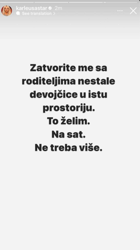 – Zatvorite me sa roditeljima nestale devojčice u istu prostoriju. To želim. Na sat. Ne treba više – napisala je Jelena Karleuša na društvenoj mreži Instagram.