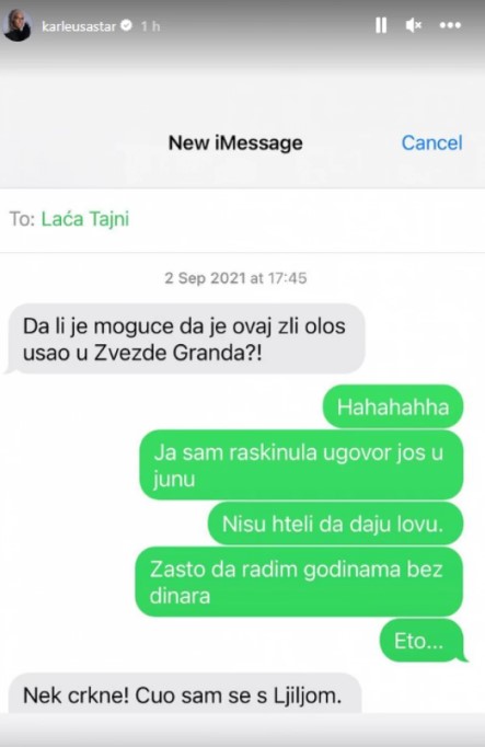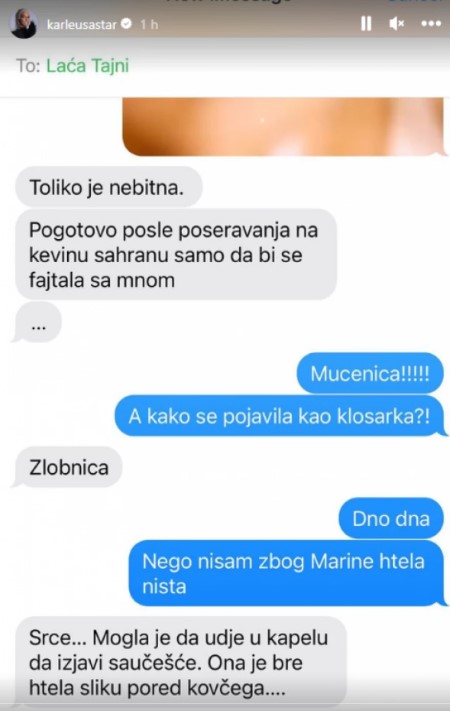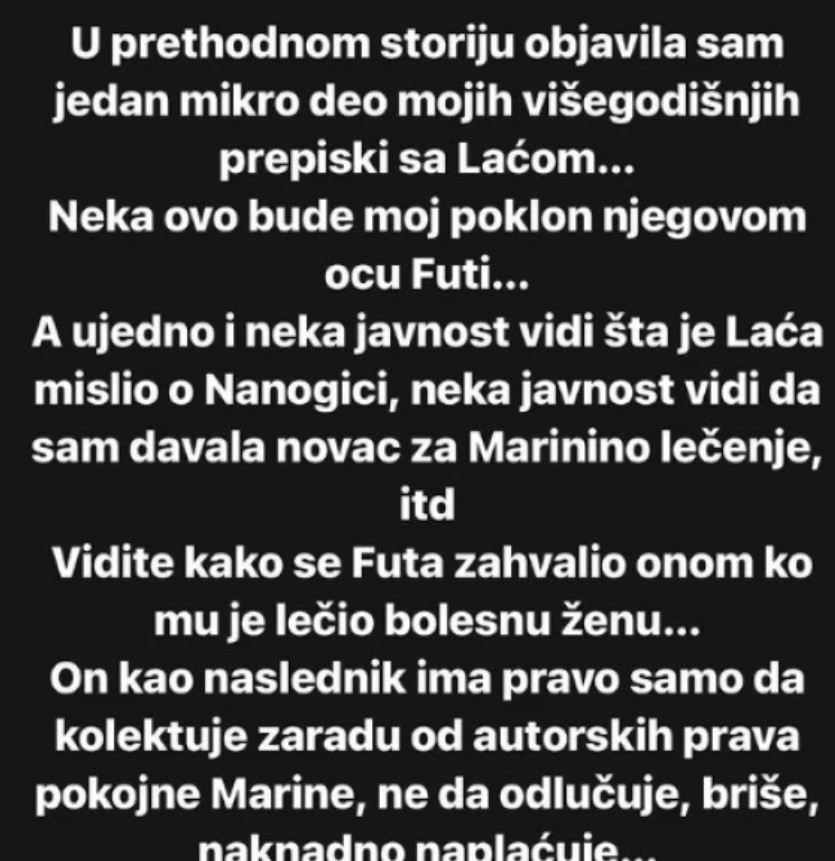 – Objavila sam jedan mikro deo mojih višegodišnjih prepiski sa Laćom… Neka ovo bude moj poklon njegovom ocu Futi… A ujedno i neka javnost vidi šta je Laća mislio o Nanogici, neka javnost vidi da sam davala novac za Marinino lečenje itd. Vidite kako se Futa zahvalio onom ko mu je lečio bolesnu ženu… On kao naslednik ima pravo samo da kolektuje zaradu od autorskih prava pokojne Marine, ne da odlučuje, briše, naknadno naplaćuje… OLOŠI, OLOŠI, OLOŠI, kojima ništa nije sveto! E pa sad neće biti ni meni – poručila je Karleuša, te objavila nekoliko poruka koje je razmenila sa Laćom.