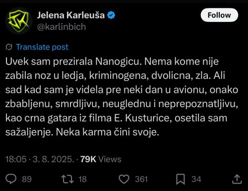 Jelena Karleuša odlučila je da se oglasi na društvenoj mreži „X“ i oplete po svojoj starijoj koleginici Svetlani Ražnatović Ceci. Naime, njihov susret u avionu od pre 2 dana nije ostao nezapažen, a Karleuša je jedva dočekala da može u svom stilu da kaže PO koju reč o Ceci.