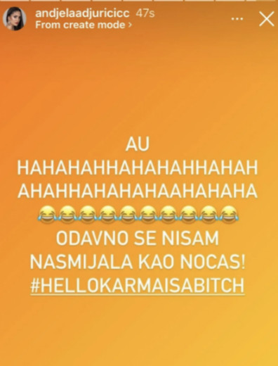 Malo potom, oglasila se i Anđela Đuričić, njena ljuta suparnica iz rijalitija „Zadruga 6“, koji se prošlog meseca završio.- Au, hahaha… Odavno se nisam nasmejala kao noćas! Ćao, karma je ku**a! – navela je Anđela tokom trajanja pomenute emisije.