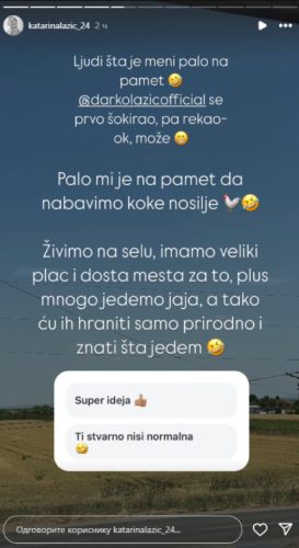 „Ljudi, šta je meni palo na pamet. Darko se prvo šokirao pa onda rekao: „Ok, moze!“ Palo mi je na pamet da nabavimo koke nosilje. Živimo na selu, imamo veliki plac i dosta mesta za to, plus mnogo jedemo jaja, a kako ću hraniti prirodno i znaću šta jedem“, napisala je Kaća na svom Instagramu.