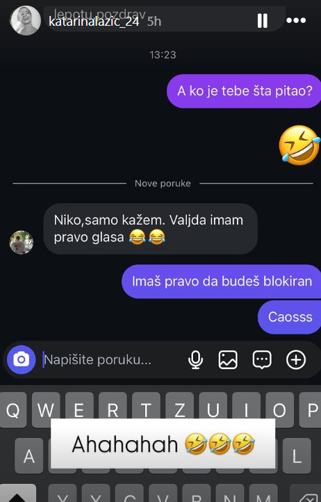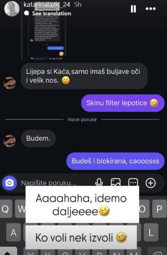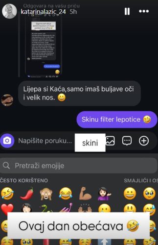 – Lepa si, Kaća, samo imaš buljave oči i veliki nos – glasila je jedna od poruka, nakon koje je Katarina blokirala dotičnu osobu, a potom napisala sledeće: