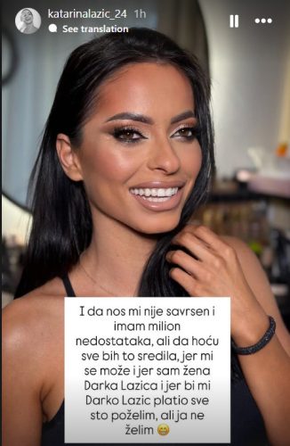 – I da, nos mi nije savršen, imam milion nedostataka, ali da hoću, sve bih to sredila, jer mi se može i jer sam žena Darka Lazića, i jer bi mi Darko platio sve što poželim. Ali, ne želim – zaključila je Katarina.