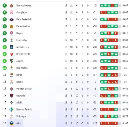 Crveno-beli imaju skor 10-8 i zauzimaju osmu poziciju, dok su crno-beli na 13. mestu sa učinkom 8-10.