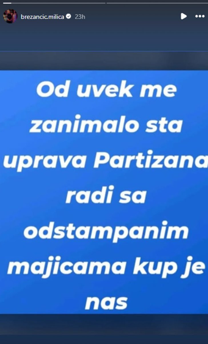 – Oduvek me je zanimalo šta uprava Partizana radi sa odštampanim majicama Kup je naš – napisala je Milica Brežančić na svom Instagramu.