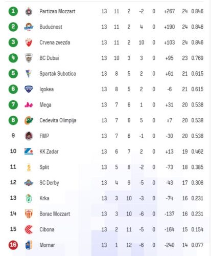 Zanimljivo da je Budućnost oba poraza takođe doživela kod kuće – jedan od Crvene zvezde, a drugi od Spartaka. I bez obzira na to, na polovini sezone je očigledno da će navedena trojka voditi žestoku borbu do kraja, a da će je aktivno pratiti i Dubai, trenutno četvrtoplasirani sa skorom 10-3.