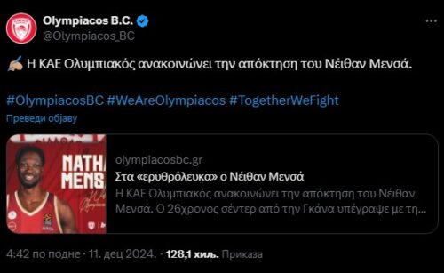 Košarkaši Olimpijakosa su postali jači pred gostovanje Zvezdi u Beogradu, pošto je novi igrač kluba iz Grčke postao Nejtan Mensa, visoki igrač iz Gane koji ima iskustvo igranja u NBA ligi, što je potvrdio klub iz Pireja.