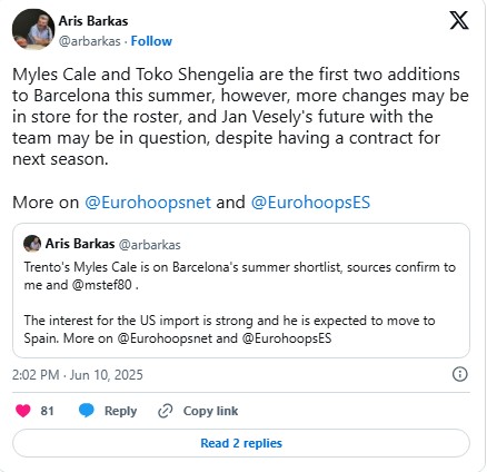 Sigurno, jedan od najcenjenijih evropskih košarkaških novinara Aris Barkas, izneo je informacije kako Barselona želi da napravi promene, a one bi mogle uključivati dovođenje Majlsa Kejla i Tornikea Šengelije.