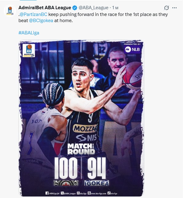Košarkaši Partizana pobedili su u Areni ekipu Igokee rezultatom 100:94 (32:26, 22:32, 29:17, 18:19) u 26. kolu ABA lige.