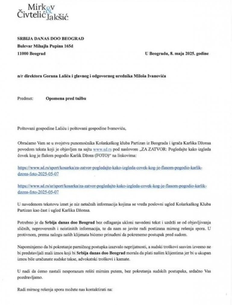 Portal Srbija Danas dobio je pretnje tužbom od strane Košarkaškog kluba Partizan. Sve zbog osude krvničkog nasilja koje je igrač ovog kluba Karlik Džons sproveo nad mladićem.