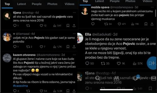 -Je li moguće da su žene razočarane jer je obelodanjeno da je Aco Pejović švaler, a one klele u njegovu vernost”. “Nego, recite mi u kojem paralelnom univerzumu živite kada vam je Aco Pejović bio primer vernog muškarca”.”Al, što su ljudi tek sada saznali da Pejović vara ženu, srećna nova 2016. godina”,”Uvek mi je Aco Pejovic bio gadan, sad je samo potvrdio”-samo su neki od mnoštvo komentara i konstatacija.