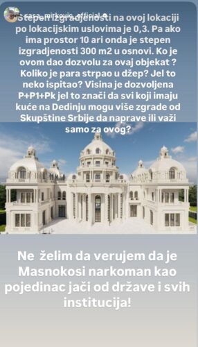 – Stepen izgrađenosti na ovoj lokaciji po lokacijskim uslovima je 0,3. Pa ako ima prostor 10 ari onda je stepen izgrađenosti 300 metra kvadratna u osnovi. Ko je ovom dao dozvolu za ovaj objekat? Koliko je para strpao u džep? Jel to neko ispitao? Visina je dozvoljena P+P1+Pk jel to znači da svi koji imaju kuće na Dedinju mogu više zgrade od Skupštine Srbije da naprave ili važi samo za ovog – napisao je Saša Mirković, pa dodao: