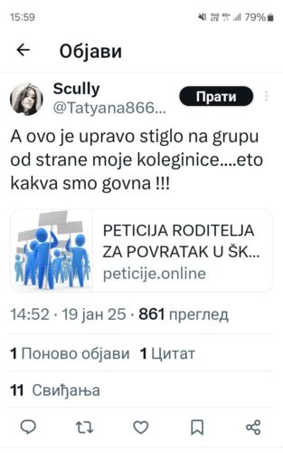 Ali i ko su oni koji ne dozvoljavaju glas razumnih ljudi koji su većina, po školskim grupama? Ko su ljudi koji prebrojavaju maloletnu decu u školskim klupama i da li smeju to da rade? I ko su ljudi koji prete i koji ismevaju one koji znaju da je raspust gotov i bezpogovorno spremaju decu za drugo polugodište? Sa kojim pravom neko pravi po društvenim mrežama spiskove i crta mete na čelu, da razumni ljudi budu u strahu što žele i zahtevaju nešto normalno? Pogledajmo sliku onih koji potpiruju ovo ludilo? Jedan od mnogobrojnih tvitova na kojima piše povodom pomenute peticije je da se ljudi koji žele da im deca uče, oslovljavaju sa „govna“.