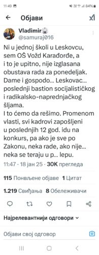 Na društvenim mrežama kruže kvazi spiskovi škola i Fakulteta koja su u obustavi, a veliki broj njih sa spiskova normalno funkcioniše. Javnost se obmanjuje na više načina. A uporno se preti ljudima da svi nastavnici koji su se zaposlili od 2012. godine će promenom vlasti ostati bez posla. Dakle, u normalnoj zemlji je normalno da bude što više posla, a ovo šikaniranje poštenog sveta predvode oni koji planiraju da otpuste sve one koji su se zaposlili u poslednjih 13 godina i to neko treba da podržava? Toliko ponižavanja roditelja koji ne žele da im deca budu bilo čije oružje. Vladanje silom i nasiljem. Najgnusnije u kojem su sve crvene linije pređene. Javašluk u kojem se većina ne čuje jer joj se preti.