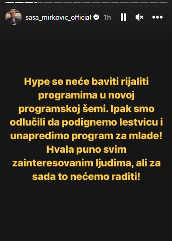 Direktor i vlasnik Hype produkcije Saša Mirković je na svom Insagram profilu potvrdio da naša televizija, ipak, neće organizovati rijaliti program.