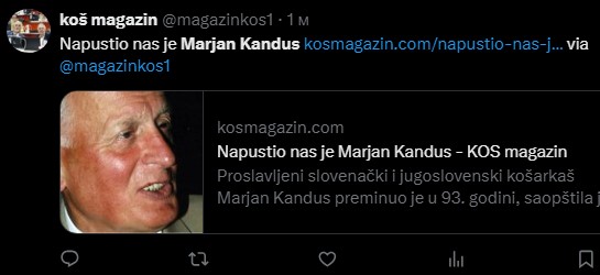 Marjan Kandus, nekadašnji košarkaški reprezentativac Jugoslavije, preminuo je u Sloveniji u 93. godini života. U uspešnoj karijeri najpre je bio član mariborskog Branika u svom rodnom gradu, a zatim je bio dugogodišnji igrač AŠK Olimpije, s kojom je četiri puta bio prvak SFRJ.