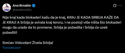 – Nije kraj kada blokaderi kažu da je kraj, KRAJ JE KADA SRBIJA KAŽE DA JE KRAJ! A Srbija je svirala kraj teroru. I ne postoji više ništa što blokaderi mogu da urade da to promene. Srbija je pobedila i Srbija će uvek pobediti! Srećan Vidovdan! Živela Srbija! – napisala je Brnabić na Iksu.