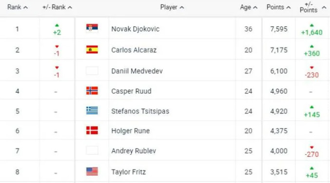 Alkaraz je pao na drugo mesto sa 7.175 bodova, treći je Danil Medvedev sa 6.100, a finalista ovogodišnjeg Rolan Garosa Kasper Rud nalazi se na četvrtom mestu.