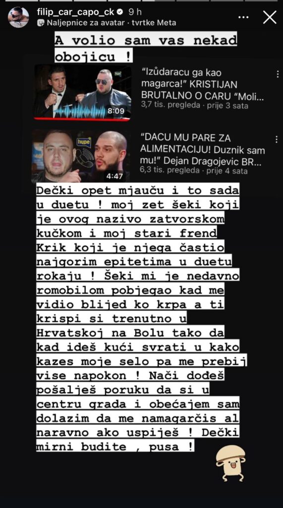 “Dečki opet mjauču i to sada u duetu ! Moj zet Šeki koji je ovog nazivao zatvorskom kuckom i moj stari frend Krik koji je njega častio najgorim epitetima u duetu rokaju ! Šeki mi je nedavno romobilom pobegao kad me vidio blijed ko krpa. A ti krispi si trenutno u Hrvatskoi na Bolu tako da kad ides kuci svrati u kako kazes moje selo pa me prebij vise napokon ! Znači dodješ posalješ poruku da si u centru grada i obecajem sam dolazim da me namagarcis al naravno ako uspijes ! Dečki mirni budite, pusa”., napisao je Car.
