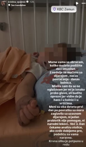 – Dobili su probiotike i lekove za rehidrataciju, ali apsolutno ništa nije pomoglo. Nenormalno su se osuli. Rekli su nam da je u pitanju takozvani „putni virus kod dece“ i da može da traje i do dve nedelje. Inače, imaju duplo veći apetit nego ranije i nemaju temperaturu, što mi je bilo jako čudno. Noćas je i Kića počeo da povraća. Danas smo otišli kod lekara i dobili uput za bolničko lečenje. Čekamo već dva dana analizu stolice. Moram da pohvalim doktore i sestre u KBC Zemun – predivni su i veoma stručni – dodala je Kristina.