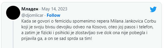 – Kada se govori o femicidu spomenimo repera Milana Jankovića Čorbu, koji je svoju bivšu devojku odveo na Kosovo, oteo joj pasoš i telefon, a zatim je fizički i psihički je zlostavljao sve dok ona nije pobegla i prijavila ga, a on se sad sprda sa tim – napisao je jedan od korisnika Tvitera, a potom dodao: