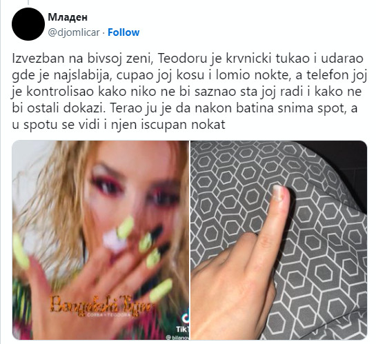 – Izvežban na bivšoj ženi, Teodoru je krvnički tukao i udarao gde je najslabija, čupao joj kosu i lomio nokte, a telefon joj je kontrolisao kako niko ne bi saznao šta joj radi i kako ne bi ostali dokazi. Terao ju je da nakon batina snima spot, a u spotu se vidi i njen isčupan nokat.