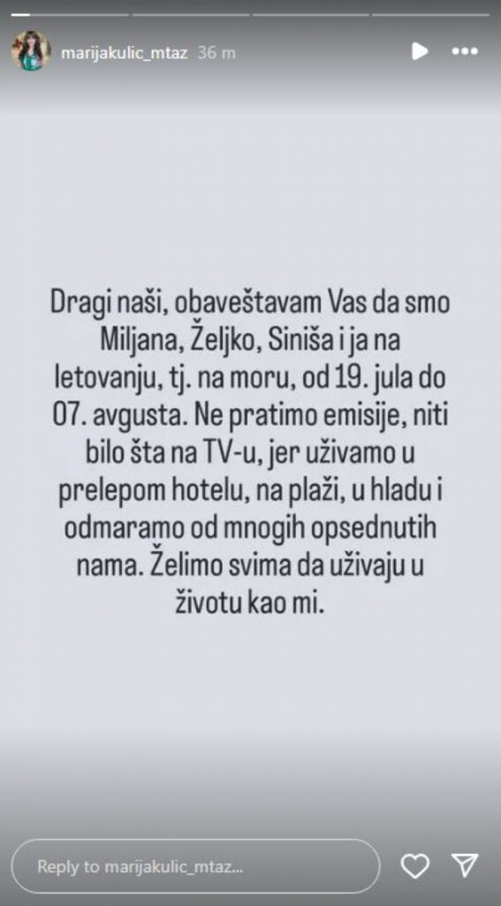 –Dragi naši, obaveštavamo vas da smo Miljana, Željko, Siniša i ja na letovanju od 19. jula do 8. avgusta. Ne pratimo emisije, niti bilo šta na TV-u jer uživamo u prelepom hotelu, na plaži, u hladu i odmaramo od mnogih opsednutih nama. Želimo svima da uživaju u životu kao mi – napisala je Marija na svom Instagram profilu.