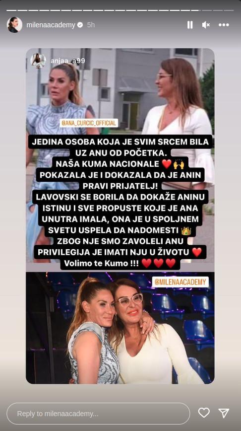 – Jedina osoba koja je uz Anu bila od početka, naša kuma internacionale. Pokazala je i dokazala da je jedini pravi prijatelj. Lavovski se borila da dokaže Aninu istinu i sve propuste koje je Ana untra imala, ona je u spoljnom svetu uspela da nadomesti. Zbog nje smo zavoleli Anu. Privilegija je imato nju u životu. Volimo te, kumo – pisalo je na fotki koju je Milena podelila na svom profilu.