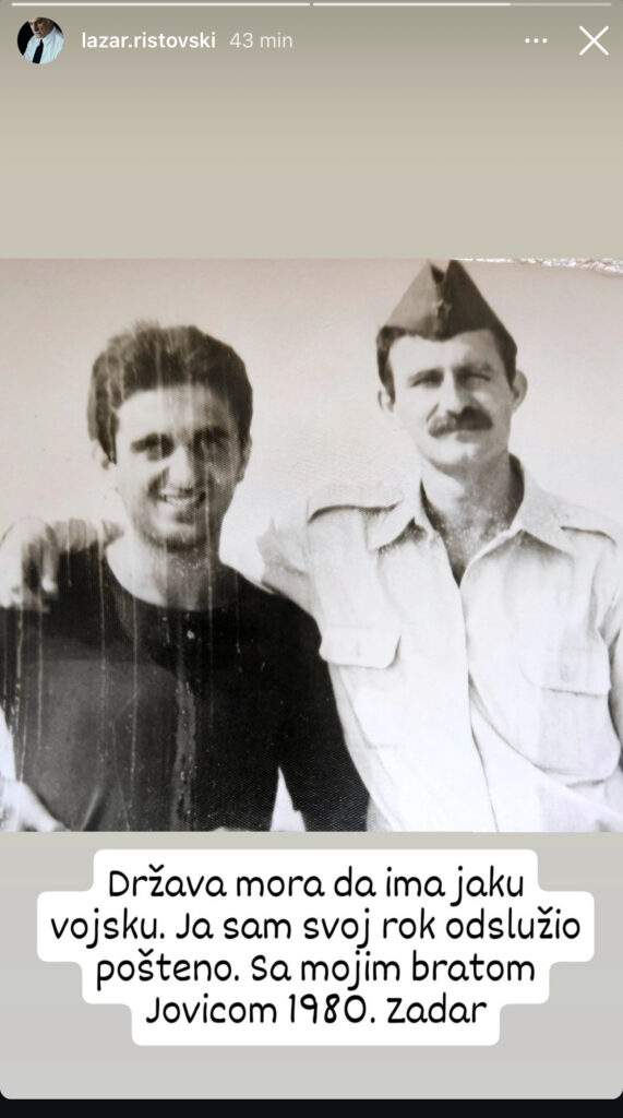 “Država mora da ima jaku vojsku. Ja sam svoj rok odsluzio posteno. Sa mojim bratom Jovicom 1980. Zadar”., napisao je Lazar u objavi.