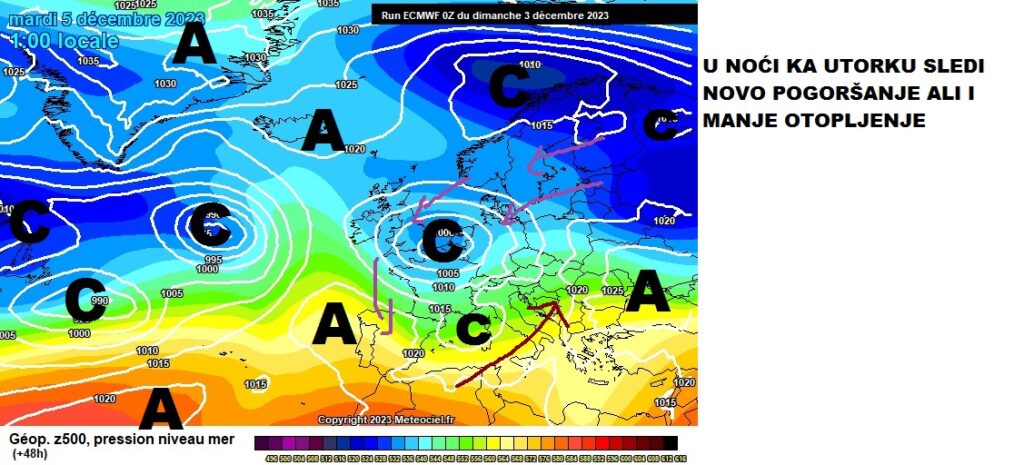 U sredu krajem dana i u noći ka četvrtku uz izmeštanje ciklona istočnije do nas ka severozapadu i severu regiona će se spustiti hladniji vazduh i u koliko tada još bude padavina sneg se očekuje na kratko i u nizijama te bi ponegde moglo doći do formiranja simboličnog, snežnog, pokrivača od oko 2 cm visine.