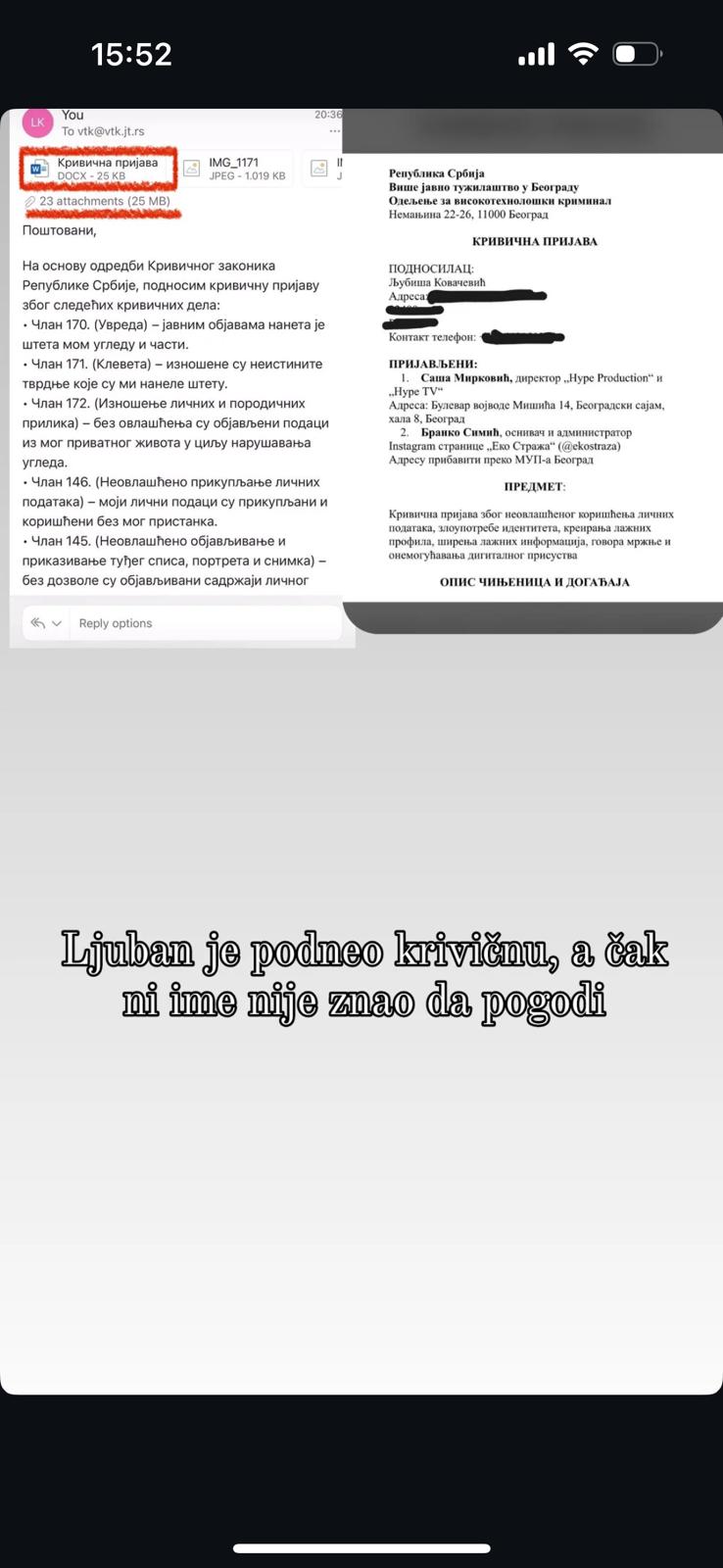– To što je pokušao da uradi, skidao slike sa Gugla i kačio kao da mu je hakovan nalog. Dakle jedan ozbiljan predator i manipulator. S tim što se prevario samo u jednoj stvari, a to je da je previše svedoka bilo da bi mogao da priča i piše ovakve stvari. Dakle, on ima pravo da se brani, ima pravo da laže, ima pravo kao i svako ko je okrivljen. I na sudu imate pravo da lažete, s tim što ovde ima mnogo dokaza, javilo se preko 50 dečaka oštećenih. Ali se javilo i mnogo poznatih javnih ličnosti koje je Ljuban Kovačević ucenjivao na taj način što im je hakovao profil. Onda je i zvao da im taj isti profil vrati. Neke je čak i prevario, nije im vratio. To je radio na vrlo perfidan način. I ljudi su nam to posvedočili u porukama.