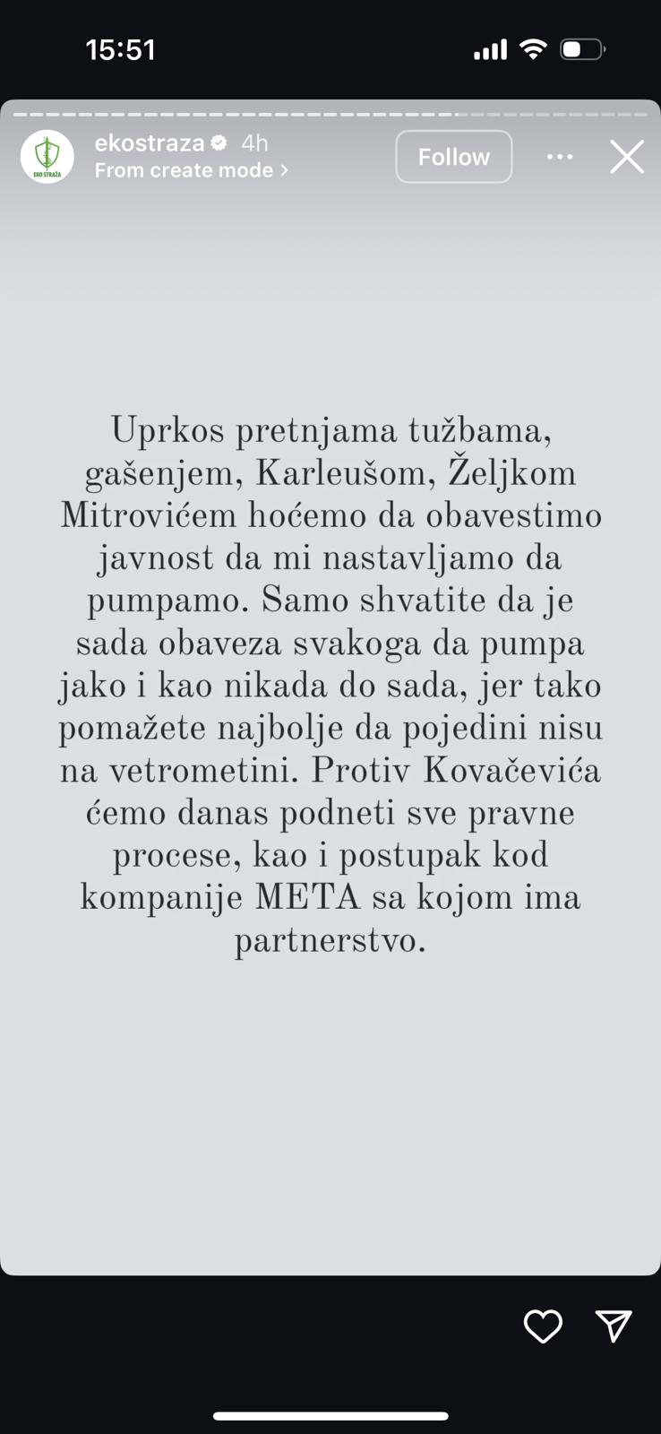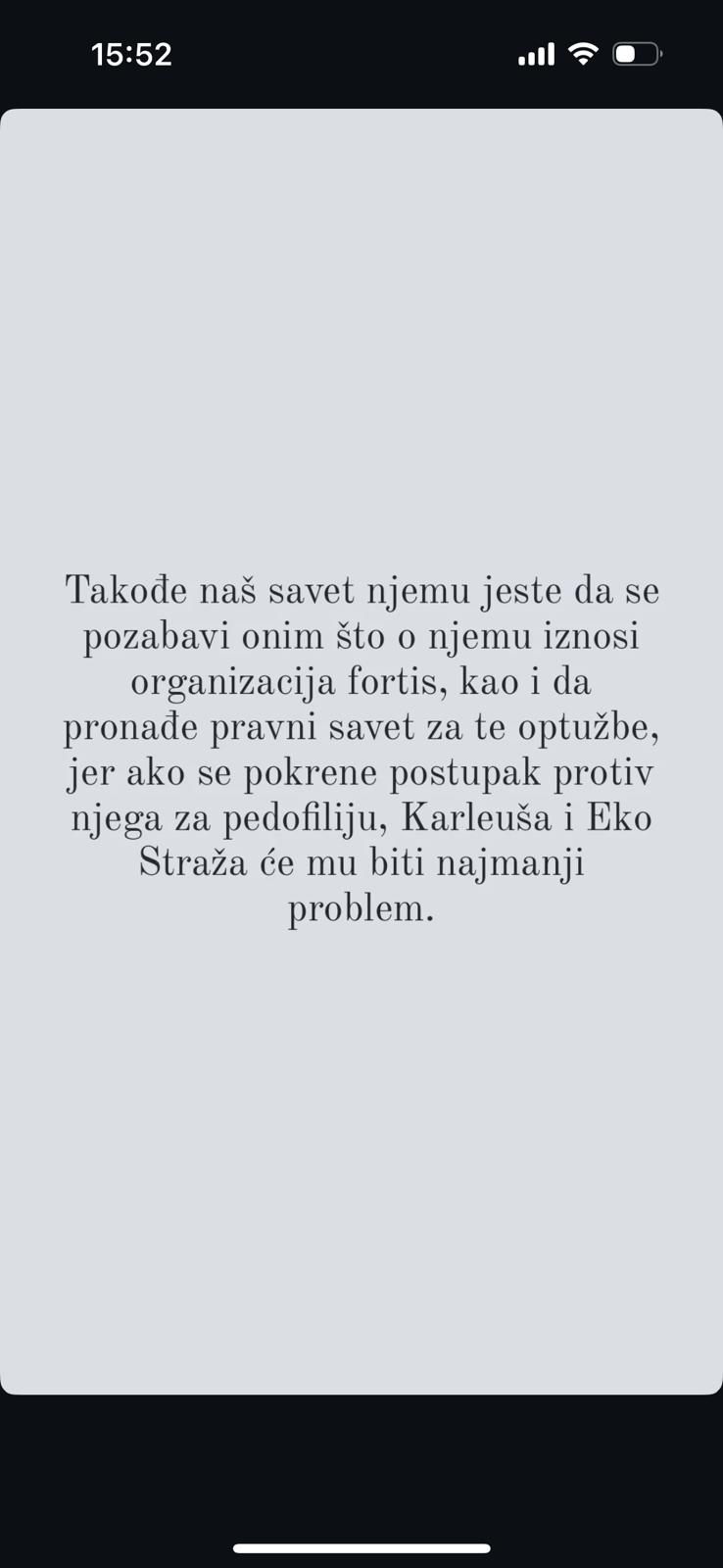 – On je u tom razgovoru koji naravno imamo snimljeno priznao sve i rekao da to radi u stanjima u kojima konzumira alkohol i opijate, da ima neku leziju na mozdu, da ne zna šta radi. Naravno to su sve, ne ulazeći u medicinsku dokumentaciju njegovu, gluposti. Jer je itekako znao šta radi kada je došao na razgovor i znao je o čemu se radi. Takođe priča i o njegovom hakovanom nalogu je laž, zato smo mu slali poruke u trenutku dok je bio tu, a profil je apsolutno aktivan i kod njega prisutan.