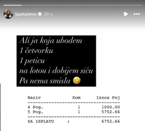 „Ali ja koja ubodem jednu četvorku i jednu peticu na Lotou i dobijem siću. Pa nema smisla“, napisala je Ljupka u opisu objave.