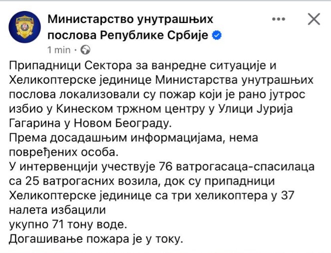 Posle 4 puna sata borbe sa vatrenom stihijom koja je zahvatila kineski tržni centar na Novom Beogradu u Bloku 70, okolni stanari mogu da odahnu.