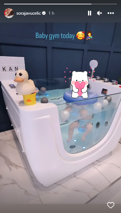 Na fotografiji koju je objavila na svom Instagram profilu, dečak se kupa u đakuziju okružen igračkicama i lopticama, dok mu je lice prekriveno stikerom radi privatnosti. Na tabli đakuzija jasno je istaknuto ime malog Kana, dok je okolo raspoređeno mnoštvo igračaka koje upotpunjuju prostor.