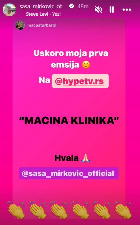 – Uskoro moja prva emisija „Macina klinika“ na „Hajp“ televiziji – istakla je Diskrecija na Instagramu, a njen stori podelio je i Saša Mirković, uz emotikone aplauza.