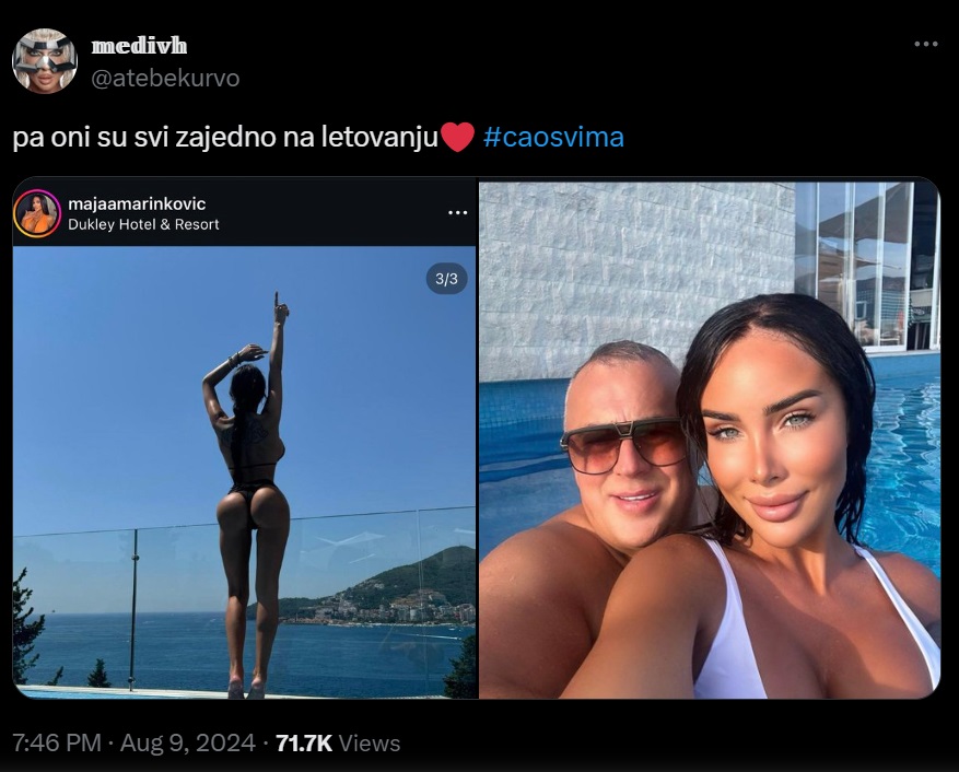 Međutim, sada je na bivšem Tviteru isplivao dokaz da su Predrag Raspopović Peca, Aleksandra Subotić i Maja Marinković u istom hotelu na Crnogorskom primorju.
