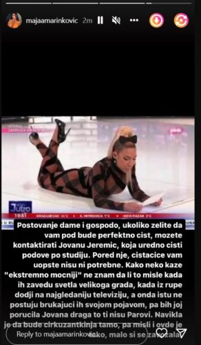 „Poštovanje dame i gospodo, ukoliko želite da vam pod bude perfektno cist, možete kontaktirati Jovanu Jeremić, koja uredno čisti podove po studiju. Pored nje, čistačice vam uopšte nisu ni potrebne. Kako neko kaže „ekstremno moćniji“, ne znam da li to misle kada ih zavedu svetla velikoga grada, kada iz rupe dođu na najgledaniju televiziju, a onda istu ne poštuju, brukajući ih svojom pojavom, pa bih joj poručila: Jovana, draga, to ti nisu „Parovi“. Navikla je tamo da bude cirkuzantkinja, pa misli ovde je tako, malo si se zavozala“, napisala je Maja.