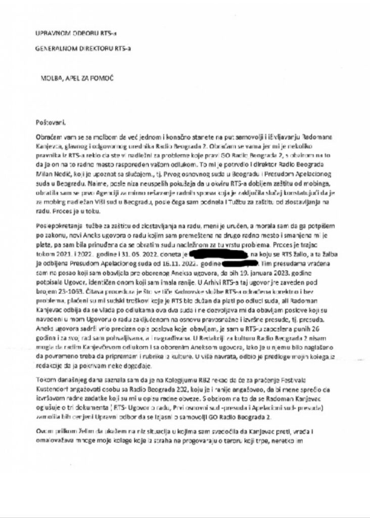 – Obraćam vam se sa molbom da već jednom i konačno stanete na put samovolji i ižvljavanju Radomana Kanjevca, glavnog i odgovornog urednika Radio Beograda 2. Obraćam se vama jer mi je nekoliko pravnika iz RTS-a reklo da ste vi nadležni za probleme koje pravi GO Radio Beograda 2, s obzirom na to da je on na to radno mesto raspoređen vašom odlukom – kaže u prijavi novinarka RTS-a koja ističe da joj je to potvrdio i direktor Radio Beograda Milan Nedić, koji je upoznat sa slučajem, tj. presudom Prvog osnovnog suda u Beogradu i presudom Apelacionog suda u Beogradu.