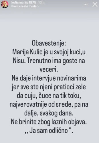 – Obaveštenje: Marija Kulić je u svojoj kući, u Nišu. Trenutno ima goste na večeri. Ne daje intervjue jer sve što njeni pratioci žele da čuju, čuće na TikToku, najverovatnije od srede, pa na dalje, svakog dana – navodi se u objavi i dodaje: