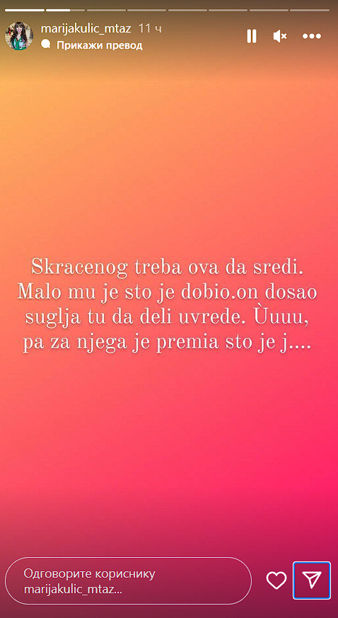 – Skraćenog treba ova da sredi, malo mu je što je dobio, on došao tu da deli uvrede… Uuu, pa za njega je premija što je je*o – napisala je Marija.