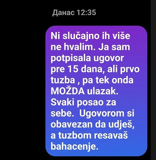 „Ni slučajno ih više ne hvalim. Ja sam potpisala ugovor pre 15 dana, ali prvo tužba, pa tek onda možda ulazak. Svaki posao za sebe. Ugovorom si obavezan da uđeš, a tužbom rešavaš bahaćenje“, napisala je. Ona je ovom porukom nagovestila tužbu. Što bi i bio logičan sled posle teške muke kroz koju prolazi njena porodica poslednja dva dana. A izgleda da je i sama Marija svesna da drugačije ne može da reši problem.
