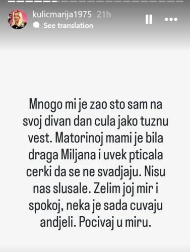 „Mnogo mi je žao što sam na divan dan čula jako tužnu vest. Matorinoj mami je bila draga Miljana i uvek je prčala ćerki da se ne svađaju. Nisu nas slušale. Želim joj mir i spokoj, neka je sada čuvaju anđeli. Počivaj u miru“, napisala je Marija.