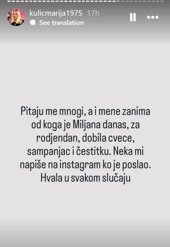 „Pitaju me mnogi, a i mene zanima od koga je Miljana za rođendan dobila cveće, šampanjac i čestitku. Neka mi napiše na instagramu ko je poslao. Hvala u svakom slučaju“.