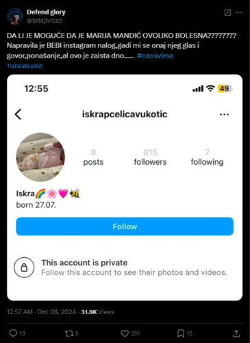 – Da li je mnoguće da je Marija Mandić ovako bolesna? Napravila je bebi Instagram nalog, ovo je zaista dno – pisalo je u objavi na drušvenoj mreži X.