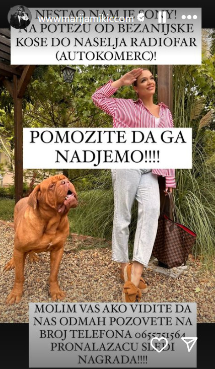 Pevačica Marija Mikić na društvenoj mreži Instagram napisala je da joj je nestao pas pod imenom Sony.