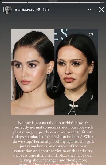 „Niko ne priča o ovome? Kako je normalno rekonstruisati svoje lice do perfekcije samo zato što želiš da se uklopiš u današnje standarde modne industrije? Kada ćemo prestati? Lično nemam ništa protiv ove devojke, samo uzimam nju za primer nove generacije i žrtvu industrije koja postavlja nemoguće standarde…“ – napisala je Marija na svom Instagram storiju.